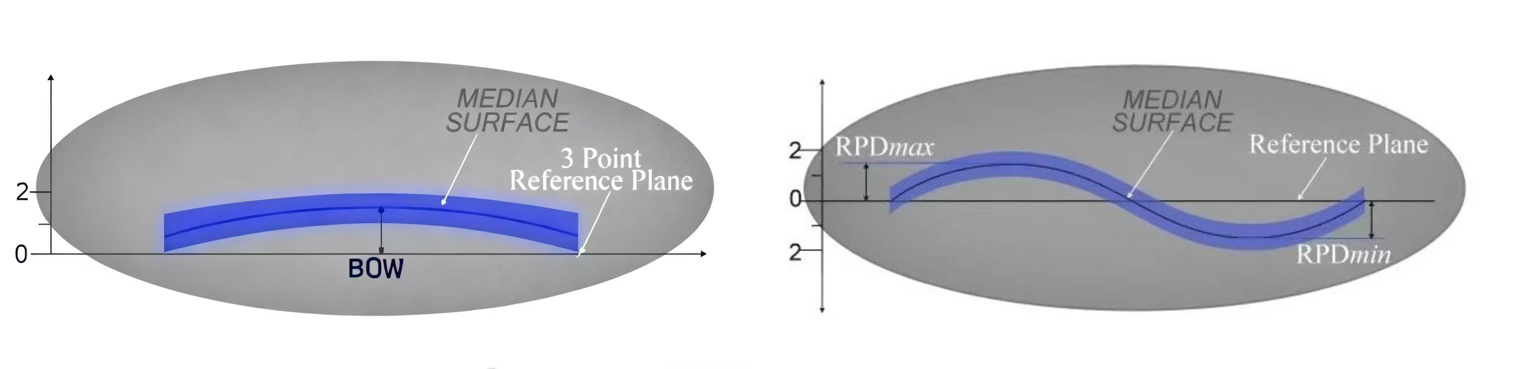 Садақ индикаторы вафли орталығы аймағының тік офсатқа бағытталған, бұл жергілікті иілу күйін көрсетеді. Бұл жергілікті жазықтылыққа сезімтал сценарийлерді бағалауға жарамды. Айналдыру индикаторы жалпы жазықтықты және бұрмалануды бағалау үшін пайдалы, өйткені ол бүкіл вафлидің бетінің ауытқуын қарастырады және бүкіл вафли үшін жалпы жазықтық туралы ақпарат береді.