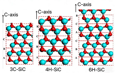 Әрине, SiC материалы бір Si атомы мен бір С атомының жалғыз тетраэдрінен емес, сансыз Si және С атомдарынан тұрады. Si және C атомдарының көп саны толқынды қос атомдық қабаттарды (С атомдарының бір қабаты және Si атомдарының бір қабаты) құрайды және көптеген қос атомдық қабаттар SiC кристалдарын түзеді. Si-C қос атомдық қабаттарының қабаттасу процесінде болатын мерзімді өзгерістерге байланысты қазіргі уақытта әртүрлі орналасуы бар 200-ден астам әртүрлі кристалдық құрылымдар бар. Қазіргі уақытта практикалық қолдануда ең көп таралған кристалдық формалар 3C-SiC, 4H-SiC және 6H-SiC болып табылады.
