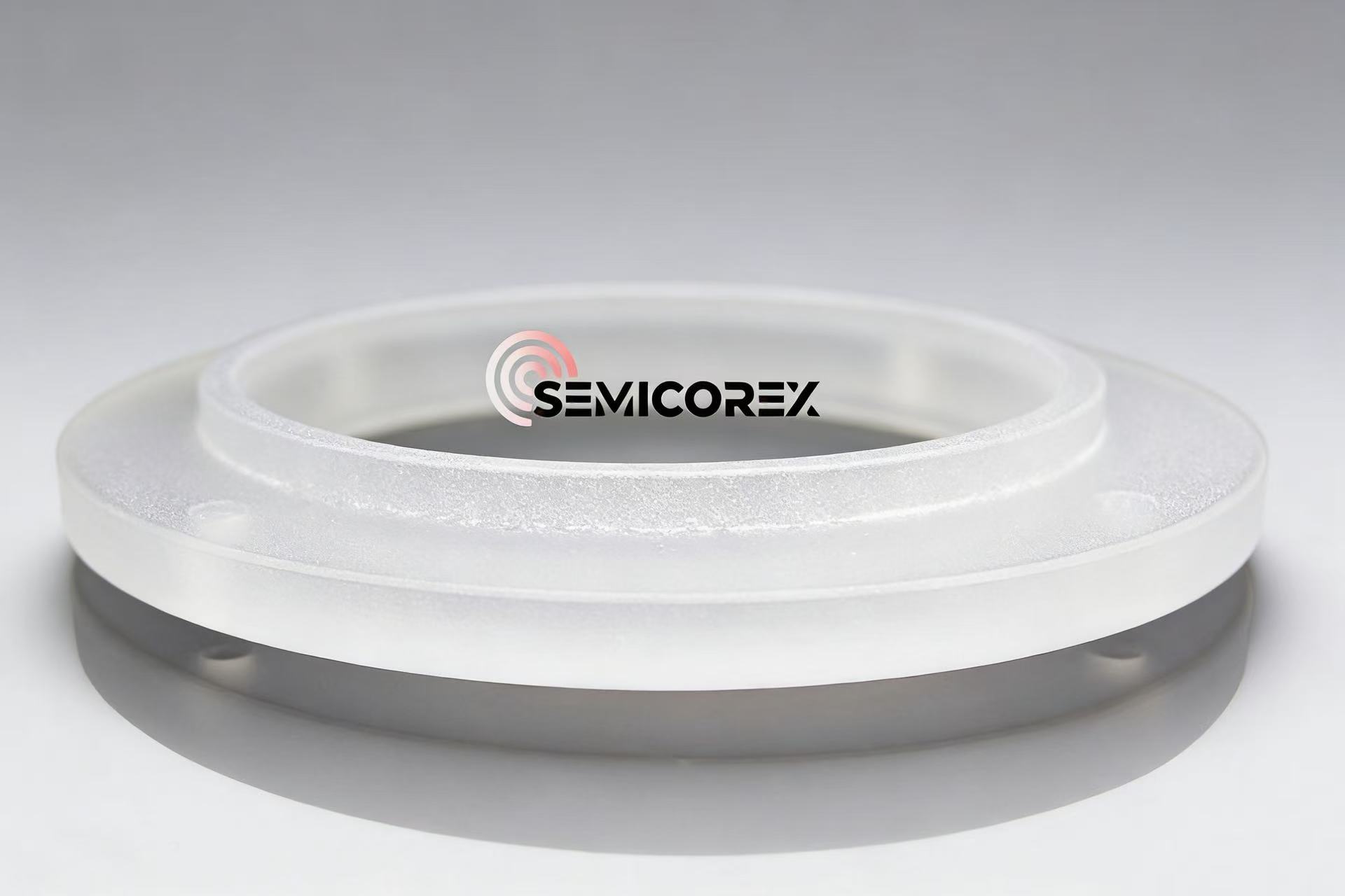 Кварц фокус сақиналарыҚұрғақ өңдеу процестері үшін арнайы әзірленген. Олар әдетте плазманы шектеу және гомогенизациялау үшін пластинаның айналасына орнатылады, бұл вафлидегі ою жылдамдығы мен өрнектің біркелкілігін тиімді қамтамасыз етеді. Бұл жұмыс ортасы плазмалық коррозияға күшті төзімділікке, өте жоғары өлшемдік дәлдікке және қалыптан тыс разрядтардың немесе бөлшектердің пайда болуына жол бермеу үшін тегіс бетті әрлеуге ие кварц фокус сақиналарын қажет етеді.