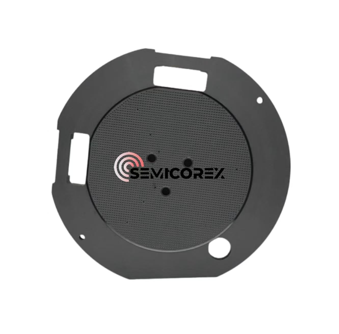 Дәл инженерлік микро саңылаулар SiC керамикалық вакуумдық патрондардың бетінде біркелкі таратылып, сыртқы вакуумдық жабдыққа сенімді қосылуға мүмкіндік береді. Жұмыс кезінде вакуумдық сорғы саңылаулар арқылы ауаны сорып алу үшін іске қосылып, жартылай өткізгіш пластиналар мен вакуумдық патрон арасында теріс қысым ортасын жасайды. Осылайша, пластинаның вакуумдық патронның бетіне біркелкі және берік ұсталуына мүмкіндік береді.